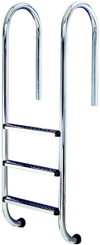 Нижняя часть состоит из 4-х ступенек, которые выполнены с противоскользящими пластиковыми накладками. Лестница предназначена для полностью заглубленных бассейнов, имеющих узкий борт. Верхняя часть поручней опускается в таканы, которые бетонируются в бортике бассейна, а лестница просто упирается в стенку через резиновые прокладки.