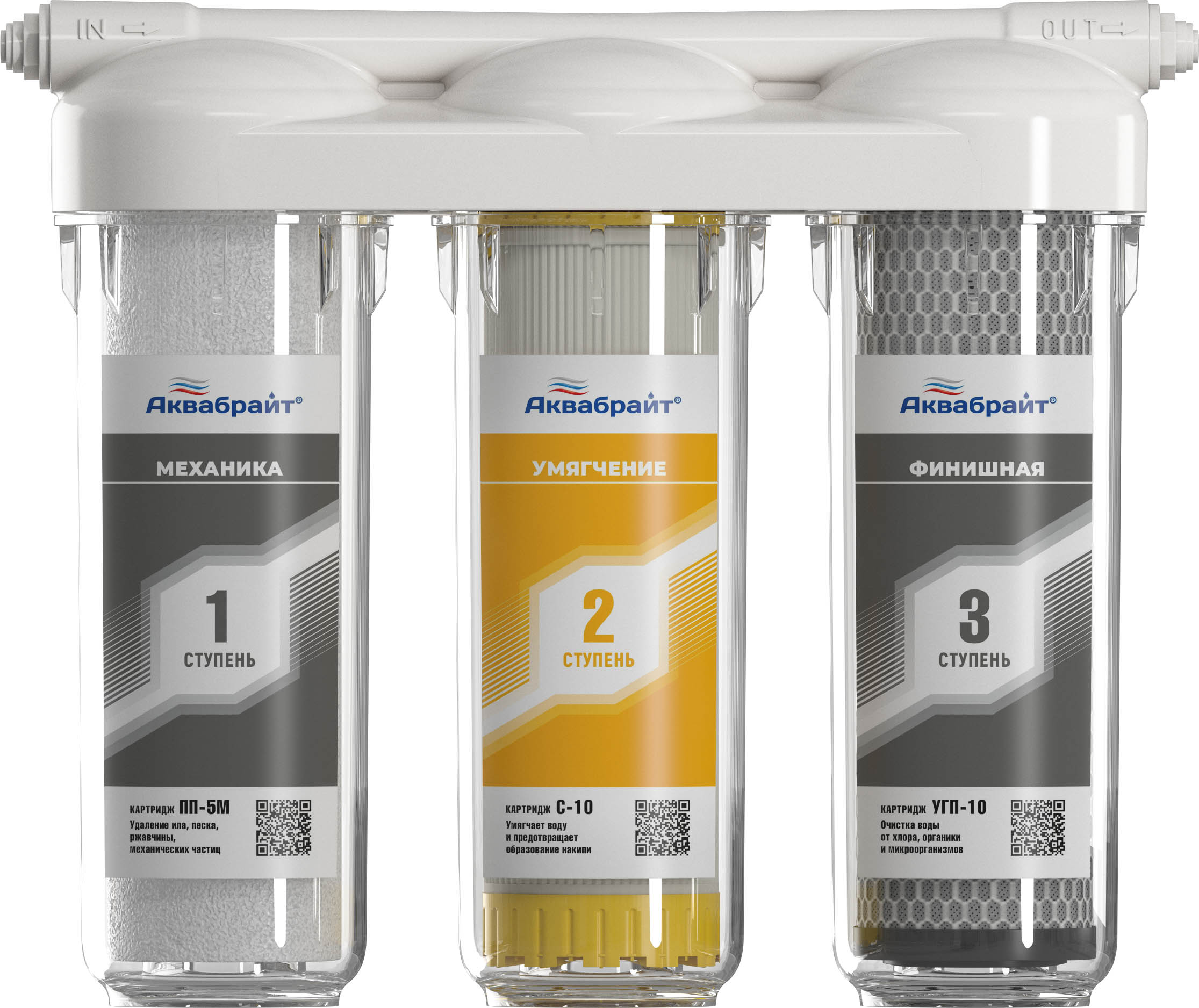 Трёхступенчатый фильтр для воды Аквабрайт серии АБФ-ТРИА предназначен для доочистки питьевой холодной воды центрального водоснабжения после предварительной подготовки от механических примесей, ржавчины, песка, ила, хлорорганических соединений, растворенного железа, тяжелых металлов, в зависимости от установленных в фильтр картриджей.
