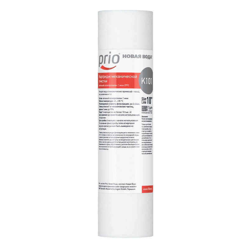 Картридж механической очистки Новая Вода К101 из полипропилена с характерным размером пор 1 мкм для холодной воды.