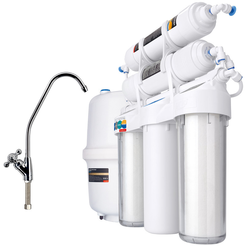 В комплект уже входят картриджи и мембрана, отдельный кран для очищенной воды, накопительный бак и всё необходимое для быстрой установки фильтра на месте эксплуатации.