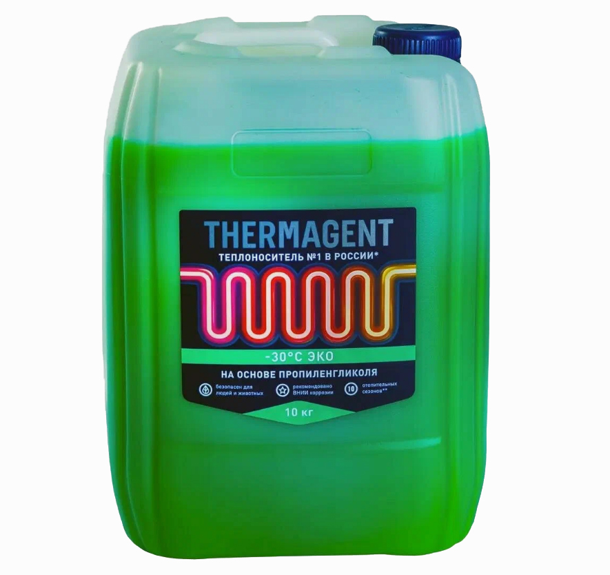 THERMAGENT EKO выпускается на основе формакологического пропиленгликоля DOW (Германия) и по новейшей технологии "Organic Acid Technology". Теплоноситель содержит нетоксичные, органические (карбоксилатные) ингибиторы коррозии и пакет специальных присадок. Предназначен для различных систем отопления и кондиционирования, обеспечивающей работу в диапазоне от -30 до 106С и в первую очередь для двухконтурных котлов и в объектах с повышенными требованиями по экологической безопасности.