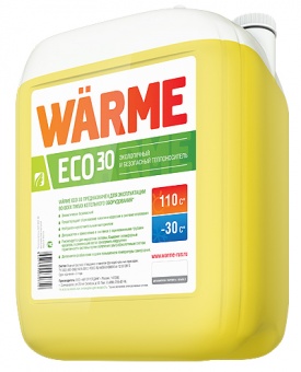 Теплоноситель Warme ЭКО-30 последнего поколения с температурой замерзания -30ºС. Теплоноситель содержит полный комплекс антикоррозийных и антипенных присадок. Теплоноситель обеспечивает экологическую безопасность при эксплуатации в системах отопления жилых помещений.