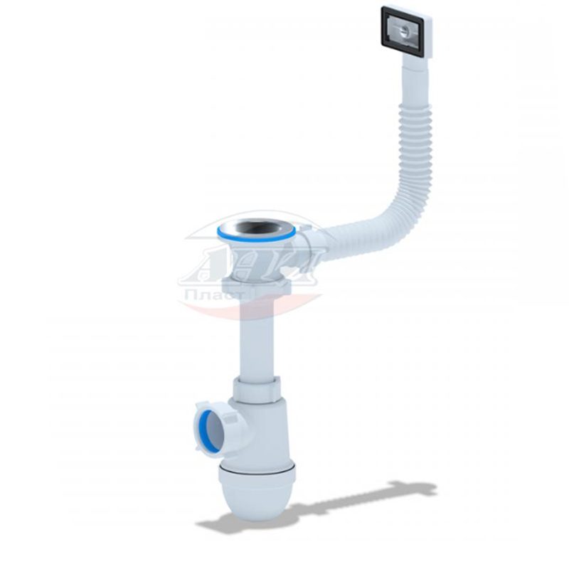 Сифон для кухонной мойки с диаметром сливного отверстия 50 мм, бутылочного типа. С разборным выпуском и нержавеющей решеткой. С гибким прямоугольным переливом для моек из нержавеющей стали.