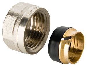 Латунный обжимной фитинг с накидной гайкой, обжимным кольцом и резиновым уплотнением для подключения медной трубы диаметром 15 мм к коллектору VALTEC.